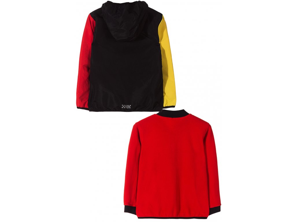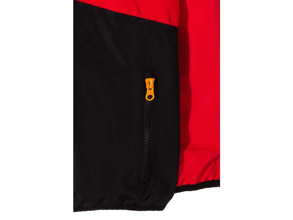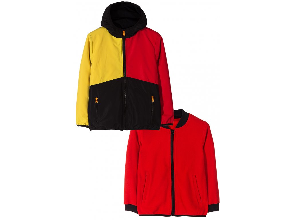 Chlapecká přechodová bunda 2v1 nabízí velmi praktickou kombinaci větrovky a mikiny v jednom. Bunda je ušitá z kvalitního materiálu, který kluky spolehlivě ochrání před větrem i deštěm. Bunda je navržena v atraktivních kontrastních barvách, součástí bundy je kapuce s jemnou podšívkou. Na předním díle jsou umístěny dvě kapsy na zip, vzadu je reflexní prvek kvůli viditelnosti při setmění. Chlapecká bunda se zapíná na zip s oranžovým uzávěrem, který se opakuje také u zipu na kapsách. Součástí bundy je červená fleecová mikina s kapsami, kterou je možné v případě potřeby z bundy odepnout pomocí zipu. Mikina má na rukávech, dole a u krku pružné lemy černé barvy.