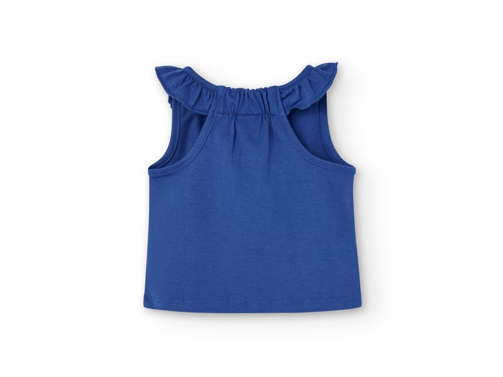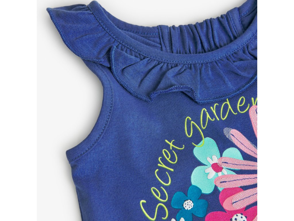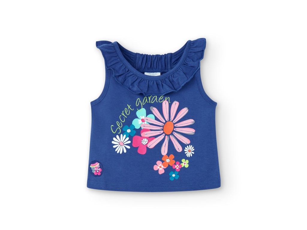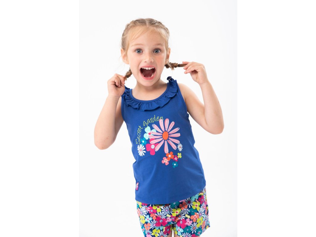 Dívčí tričko bez rukávů nabízíme v krásné modré barvě. Bavlněné tílko pro dívky hned zaujme pestrým potiskem kytiček. Dívčí tílko má kulatý výstřih, který je olemovaný ozdobným kanýrkem.