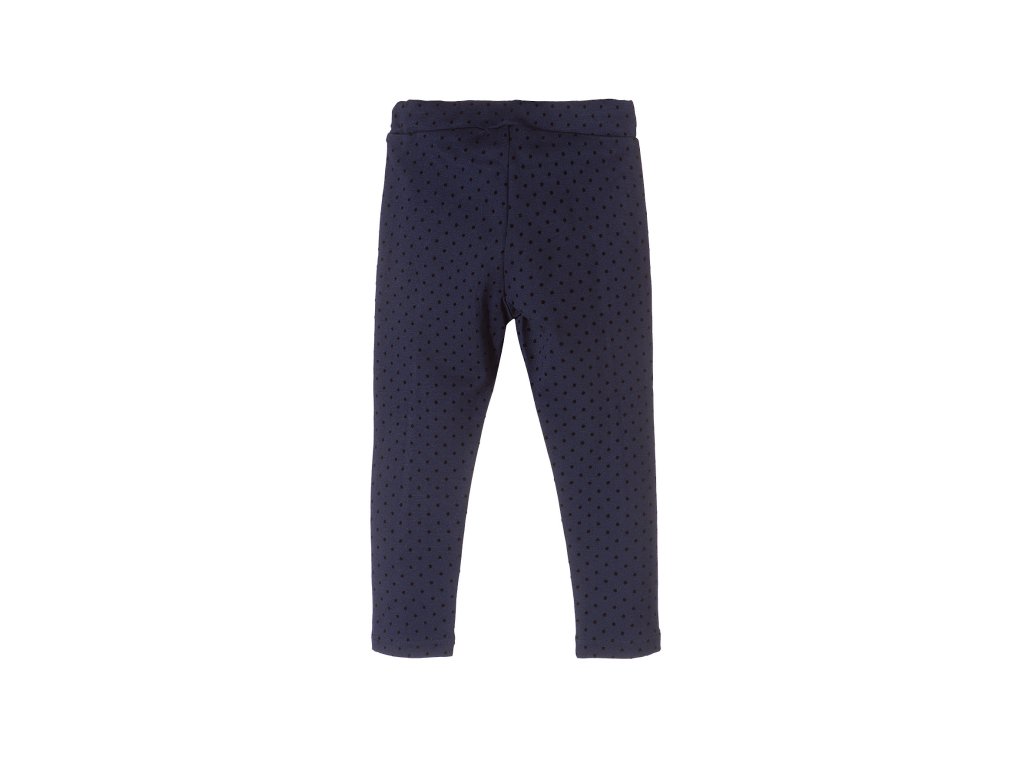 Úpletové modré kalhoty s černými puntíky jsou v pase na gumu, aby se holčičkám příjemně nosily.