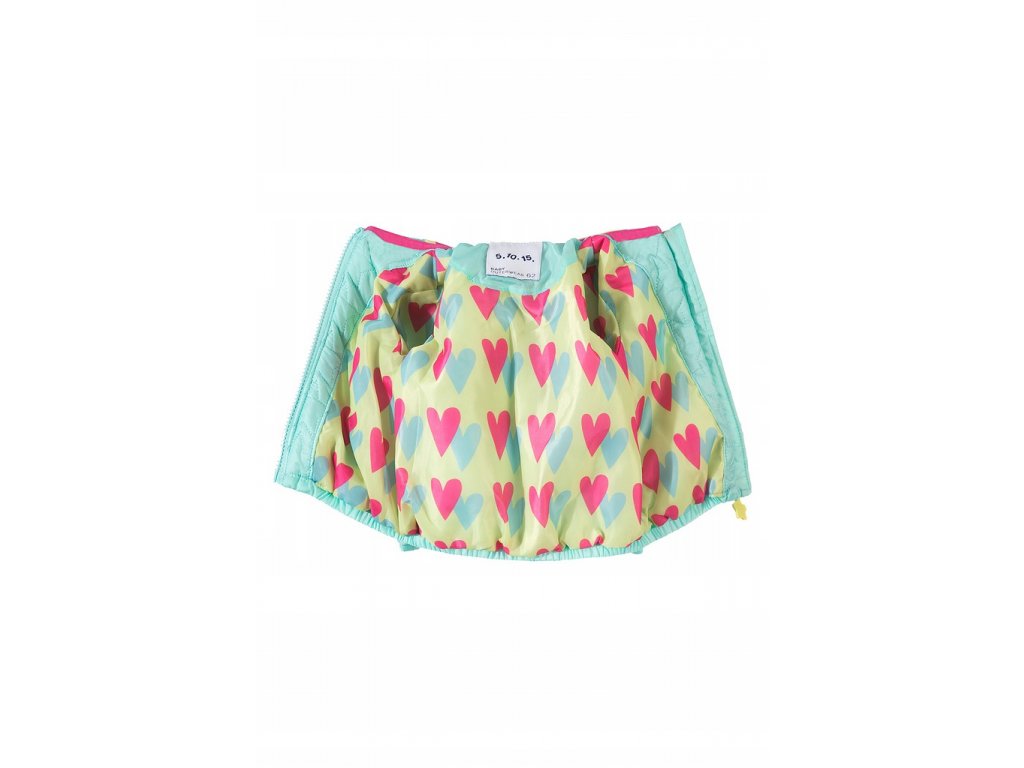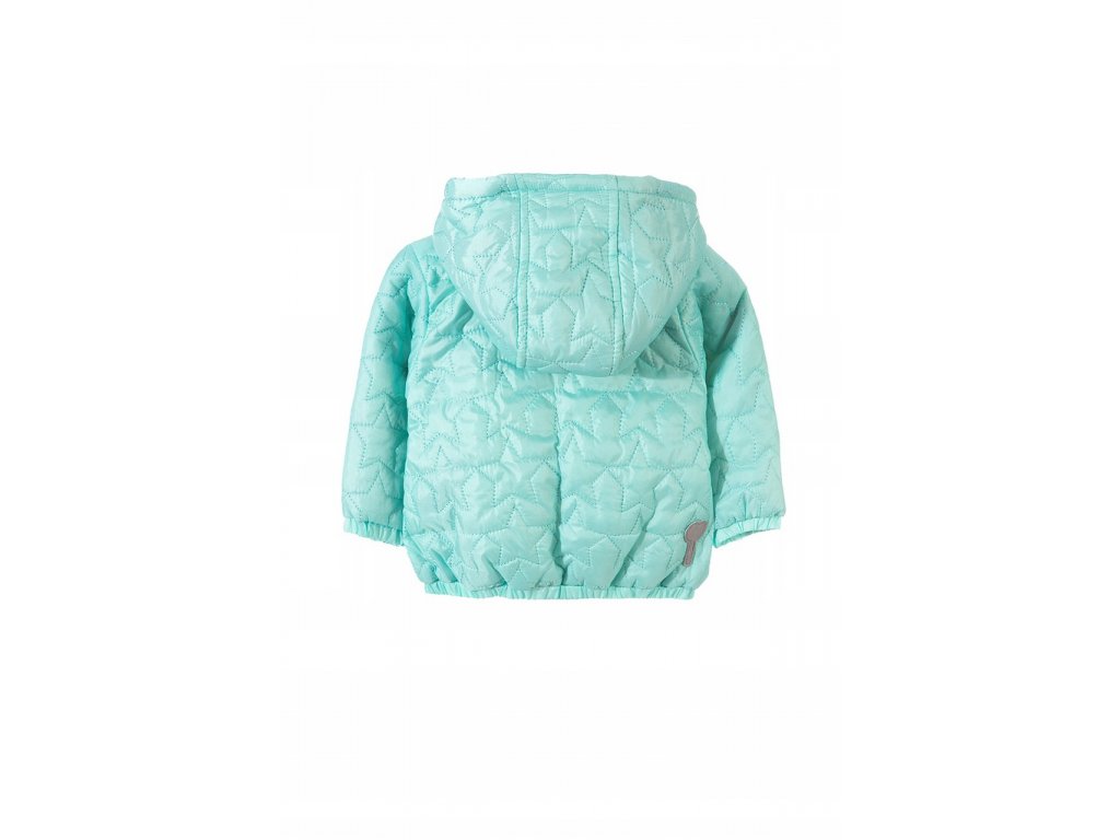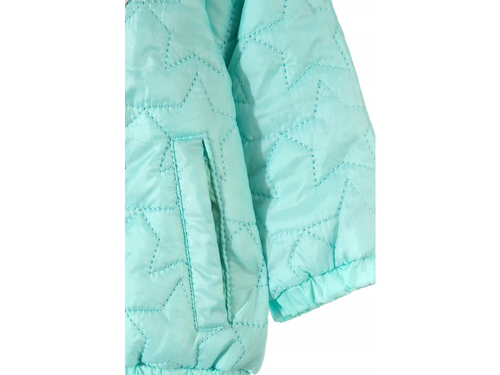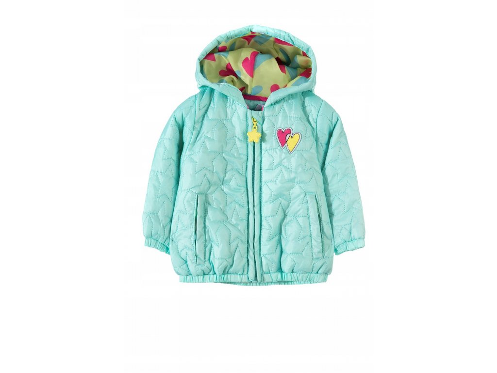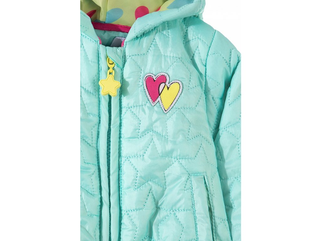 Přechodová prošívaná bunda pro nejmenší holčičky má nápadnou barevnou podšívkou v kapuci. Tato kojenecká bundička je skvělou volbou pro vrtkavé jarní nebo podzimní počasí. dem. Celý povrch oděvu je ozdoben dekorativním prošíváním ve tvaru hvězd. Na přední straně jsou dvě kapsy a také nášivka s růžovým a žlutým srdcem. Přechodová bunda se zapíná na zip zakončený okouzlujícím přívěskem zobrazujícím žlutou hvězdu. Zevnitř má bunda barevnou podšívku ve stejném designu jako v kapuci. Bundička je volného střihu, což zaručuje pohodlí a volnost pohybu. Na zadní straně je malý reflexní prvek, který zajišťuje dobrou viditelnost i po setmění.