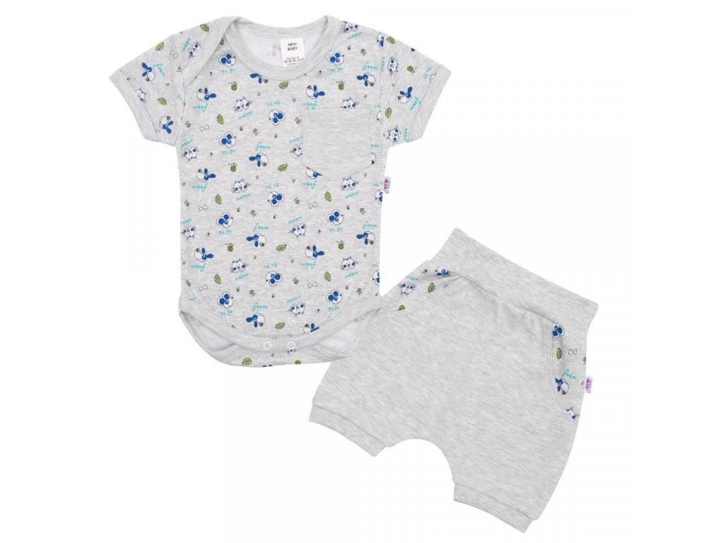 Kojenecká dvoudílná soupravička z bavlny obsahuje kraťasy a body s krátkým rukávkem. Body zdobí celoplošný drobný potisk zvířátek a našitá šedá kapsička. Okolo krčku, rukávků a nožiček je šedé lemování. Body se zapíná mezi nožičkami na cvočky a u krku je z jedné strany volný přehyb pro pohodlné oblečení. Roztomilé kraťásky mají v pase široký pružný lem, který netlačí na bříško miminka. Jsou bez kapsiček, střih a kombinace vzoru a šedé je jen imituje. Na nohavičkách jsou užší pružné lemy a stylový, ale praktický střih dodává kraťaskům ten správný šmrnc.